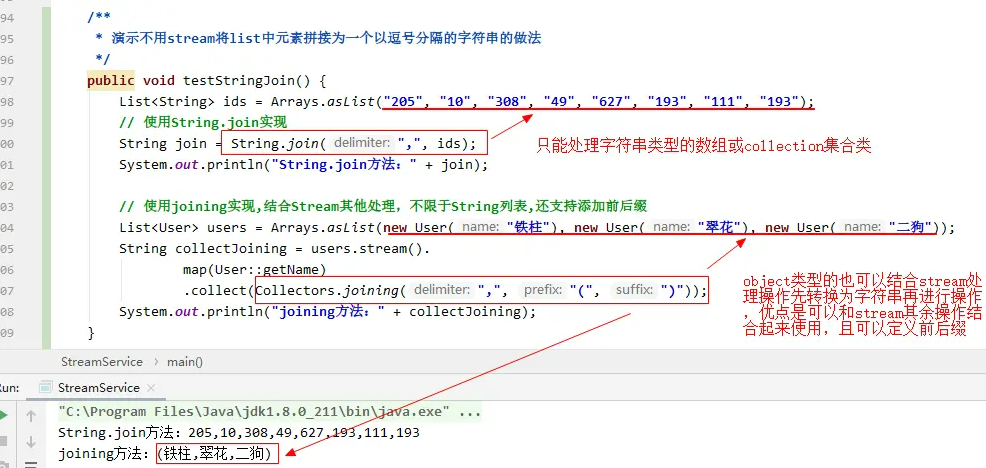 关于这里的说明,评论区中很多的小伙伴提出过疑问,就是这个场景其实使用 String.join() 就可以搞定了,并不需要上面使用 stream 的方式去实现。这里要声明下,Stream的魅力之处就在于其可以结合到其它的业务逻辑中进行处理,让代码逻辑更加的自然、一气呵成。如果纯粹是个String字符串拼接的诉求,确实没有必要使用Stream来实现,毕竟杀鸡焉用牛刀嘛~ 但是可以看看下面给出的这个示例,便可以感受出使用Stream进行字符串拼接的真正魅力所在。