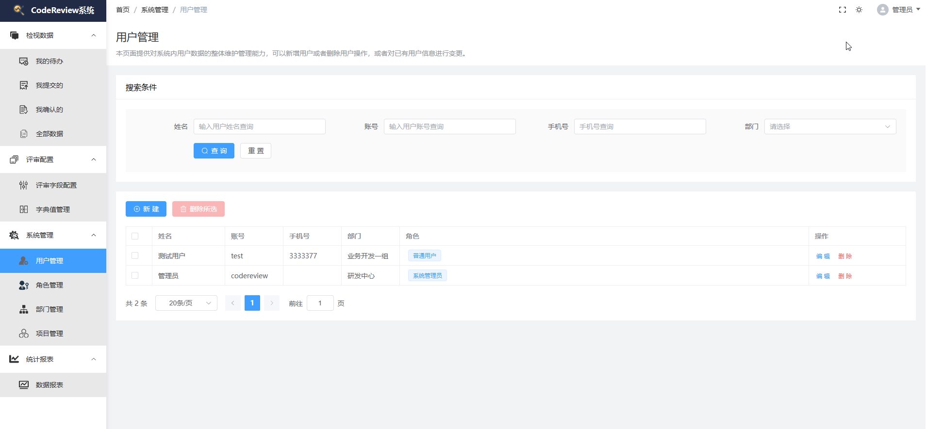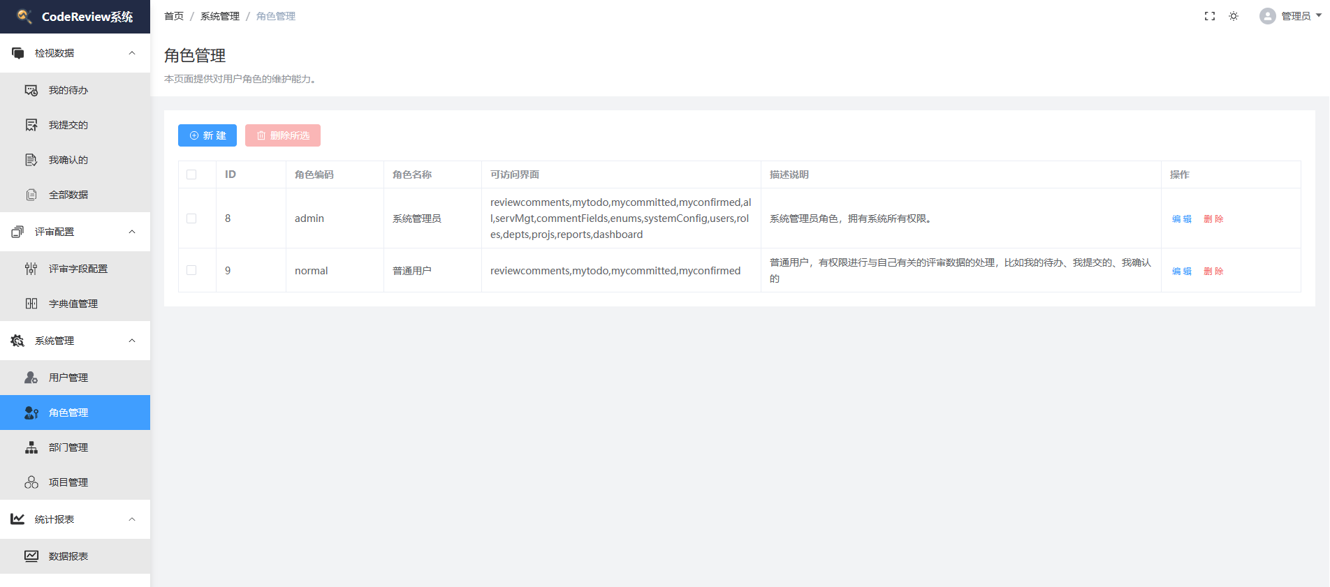 系统的访问权限基于角色进行控制。默认情况下,系统预置了系统管理员和普通用户两种角色,其中系统管理员拥有全部界面访问权限,而普通用户可以访问与自己有关的评审数据的界面。