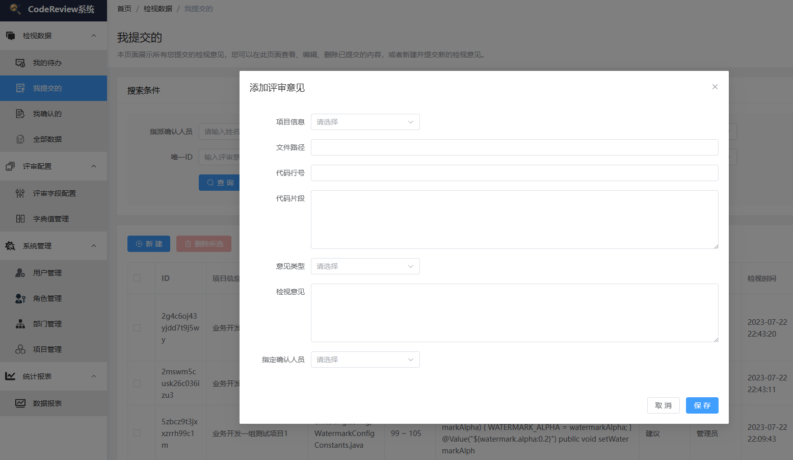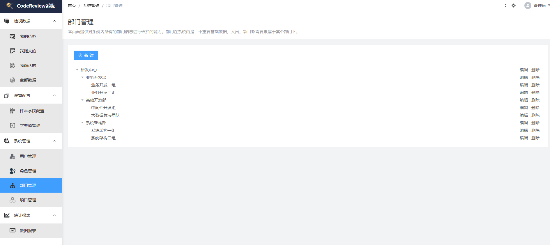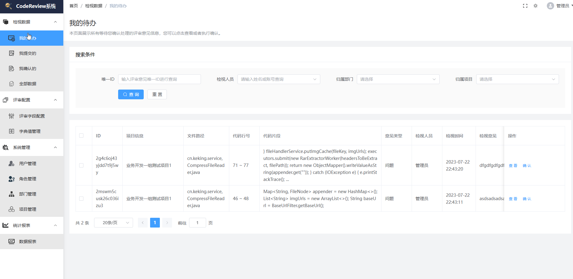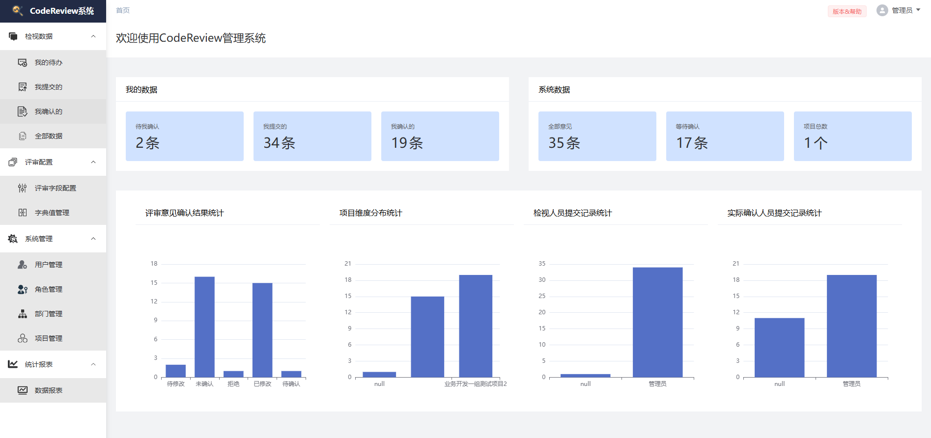 登录系统之后,首页可以查看自己的待办事项、自己的代码review提交记录等信息,以及系统整体的代码检视数据统计,并且提供了几个不同维度的简单数据统计。