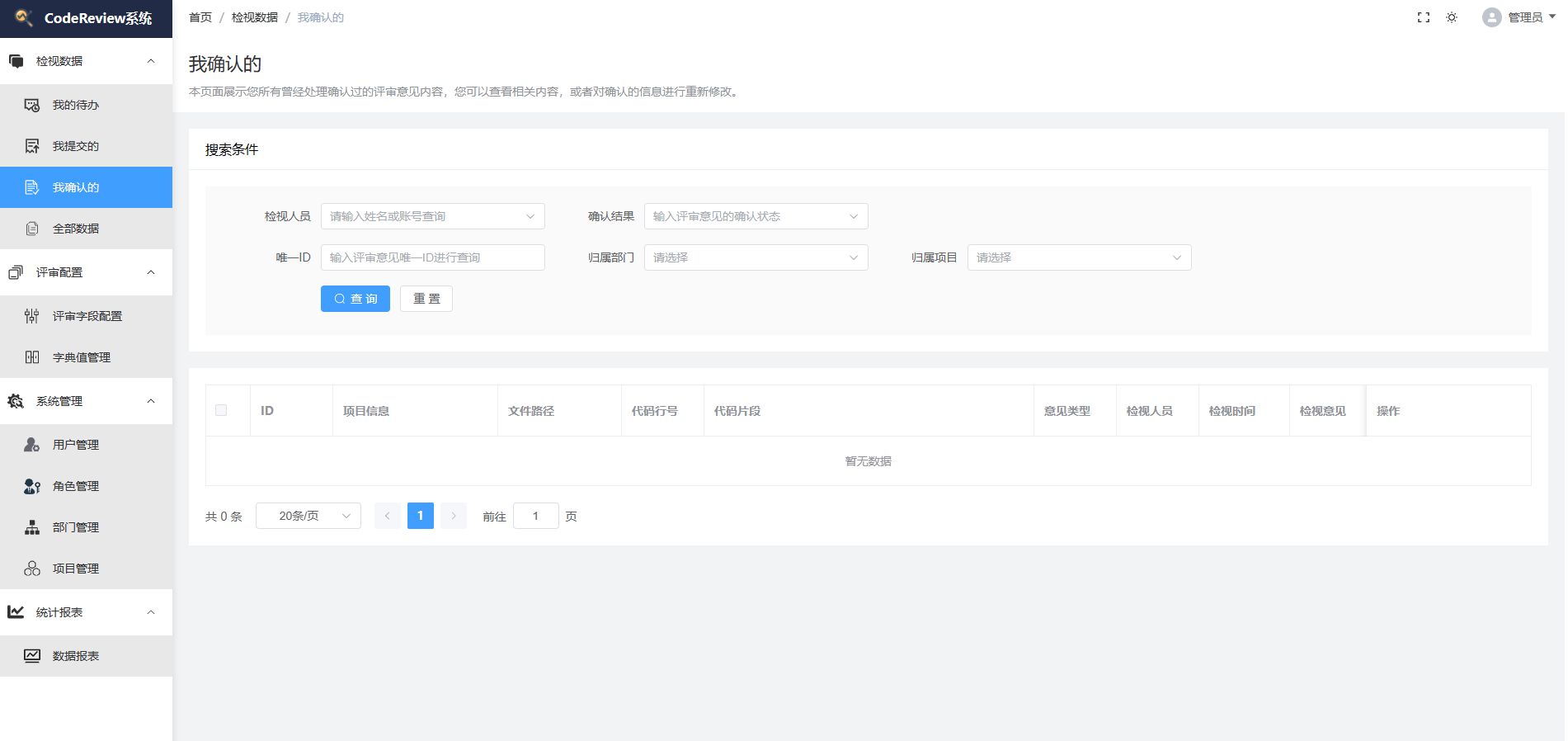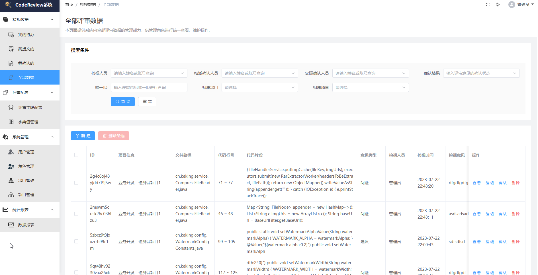 如果您是管理员角色,则您可以查看系统内所有的代码review记录数据,并可以对记录进行所有操作。如果您的系统对review数据有保密性要求,请慎重分配有权查看此界面的人员权限。