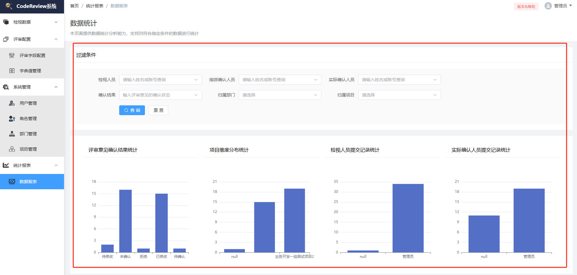 在数据报表界面,提供了几个不同维度的数据统计报表展示,方便对系统内的整体代码检视事项推进情况有个整体的把控。